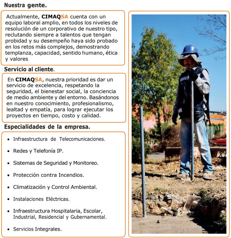 En CIMAQSA , nos distinguimos por ser una empresa con conciencia social, responsabilidad y un firme compromiso con la excelencia. Nuestra principal fortaleza radica en la ejecución eficiente de proyectos de alto impacto, respaldados por una ética profesional sólida y una estrecha colaboración con nuestrosclientes y aliados estratégicos.