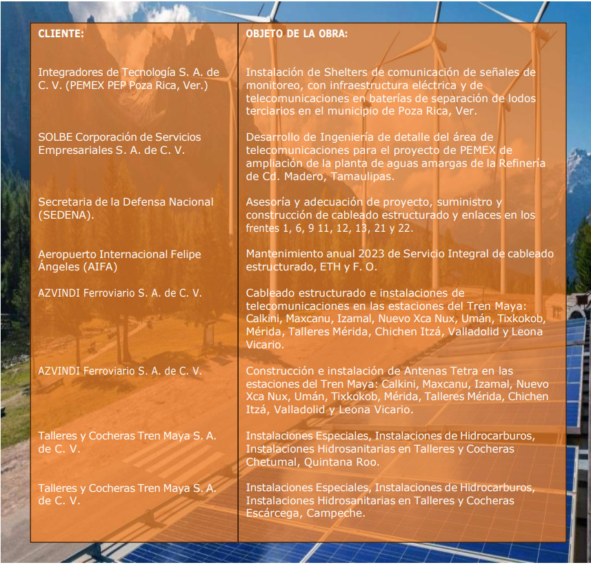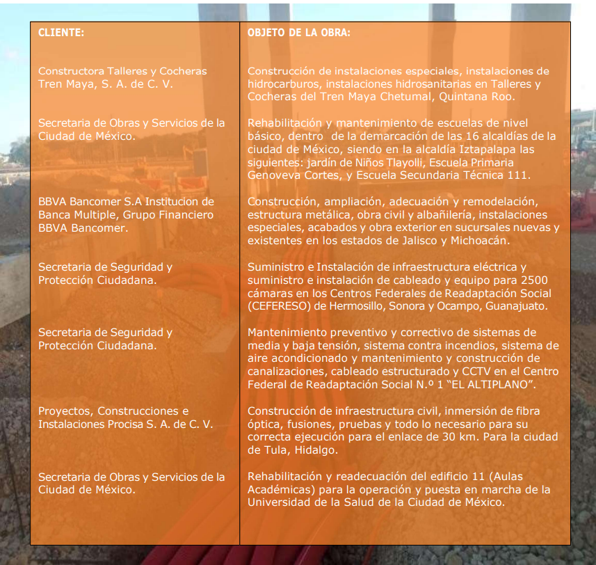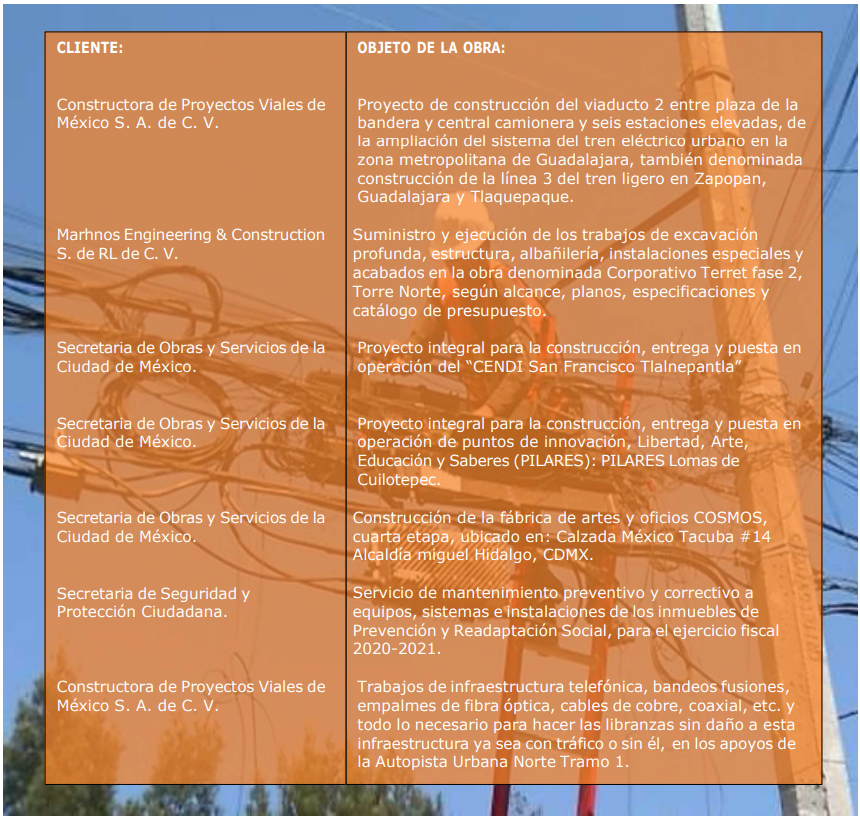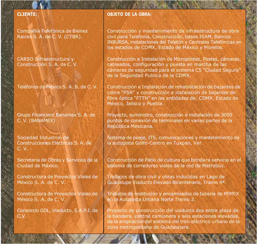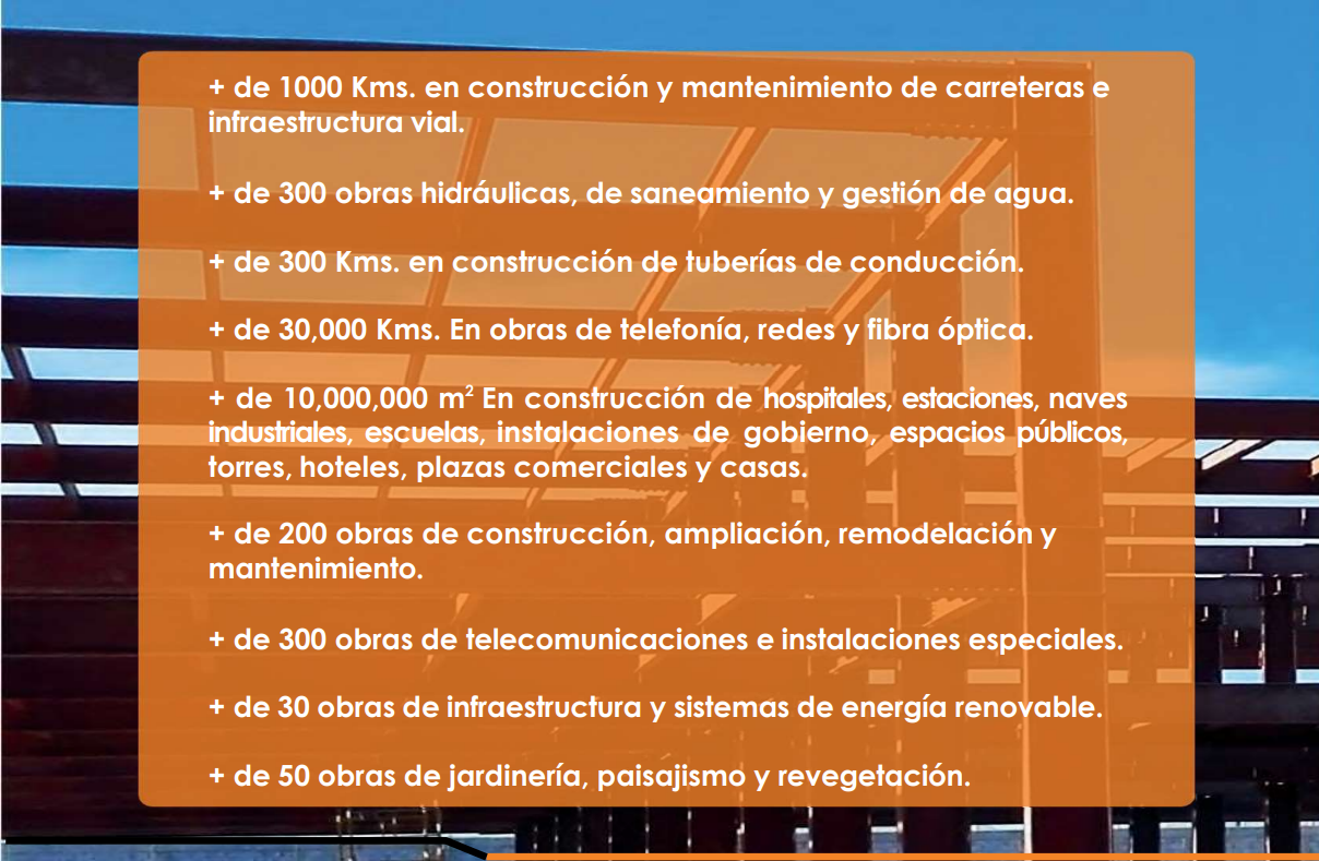 La solidez de nuestra experiencia y la calidad en cada uno de nuestros servicios nos han consolidado como una empresa confiable para nuestros clientes, contribuyendo activamente al desarrollo de infraestructura en México y sus regiones circundantes. Nuestra trayectoria nos respalda como un socio estratégico en proyectos de alto valor, tanto en el sector público como en el privado.